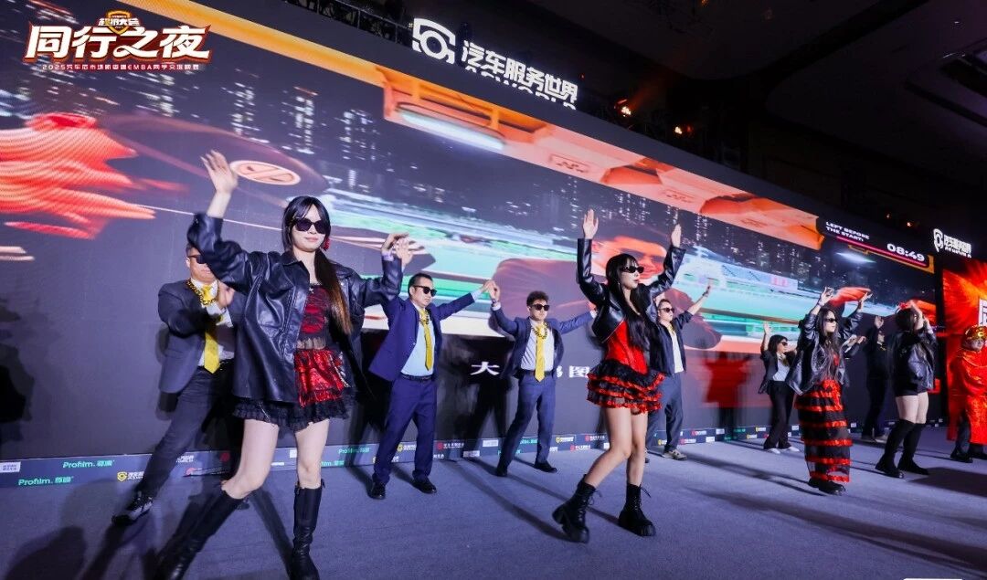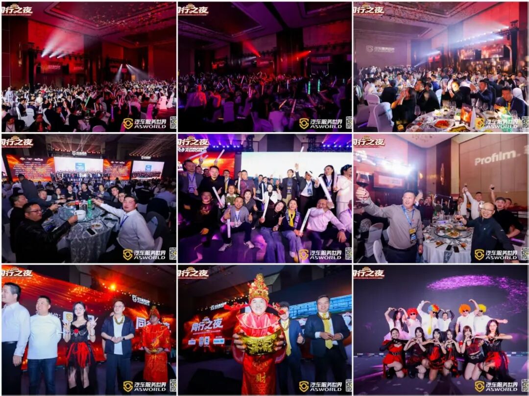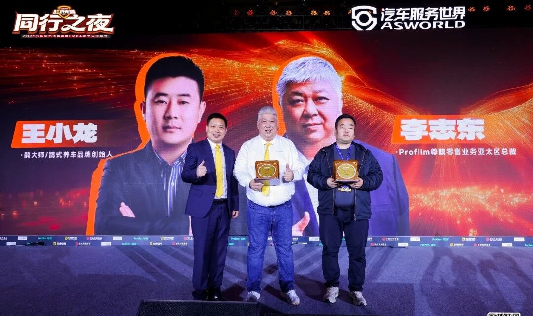 汽车服务世界CEO胡军波、晚宴独家冠名商Profilm董事长李玉、Profilm尊膜零售业务亚太区总裁李志东,共同上台,为今天的晚宴致祝酒词,晚宴正式开始。