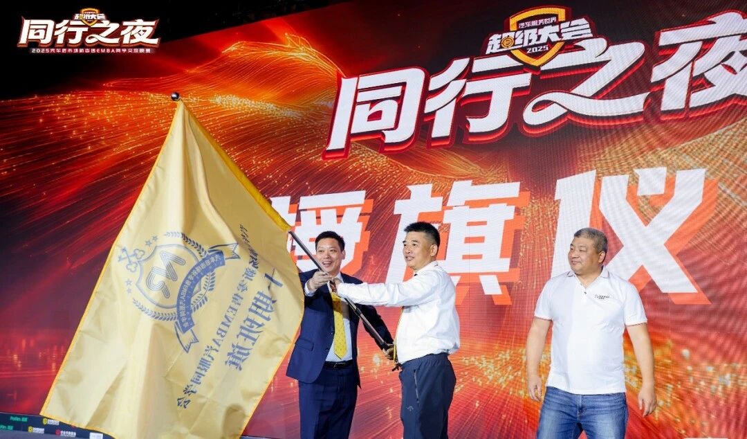 接下来的环节,汽车服务世界CEO胡军波为最新一期的EMBA 10班同学授班旗,10班班长黄伟上台接旗,10班政委邓龙上台护旗。